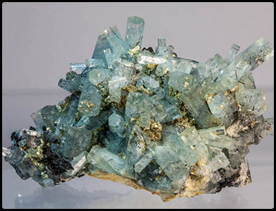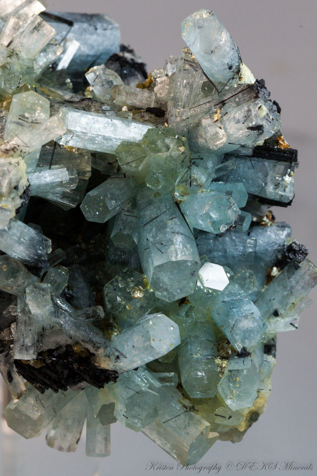 Aquamarine and Mica on Schorl Matrix Erongo | 11.5 x 7 x 8 cm | 253 grams | | An incredibly aesthetic Aquamarine cluster of well terminated crystals, surrounded by small deposits and flakes of Mica on a Feldspar and Schorl matrix. An Excellent specimen!